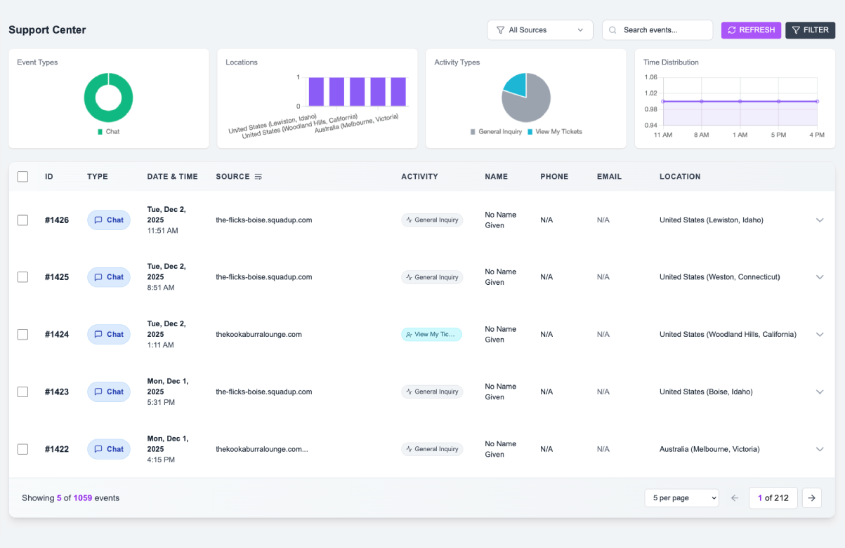 Track every interaction, see what customers ask, and identify support trends.