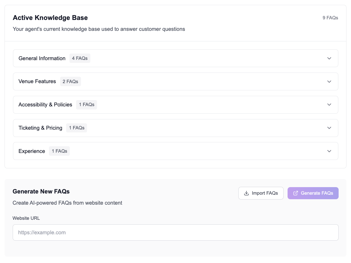 Automatically generate FAQs from your website. The AI continuously learns from interactions to improve accuracy.
